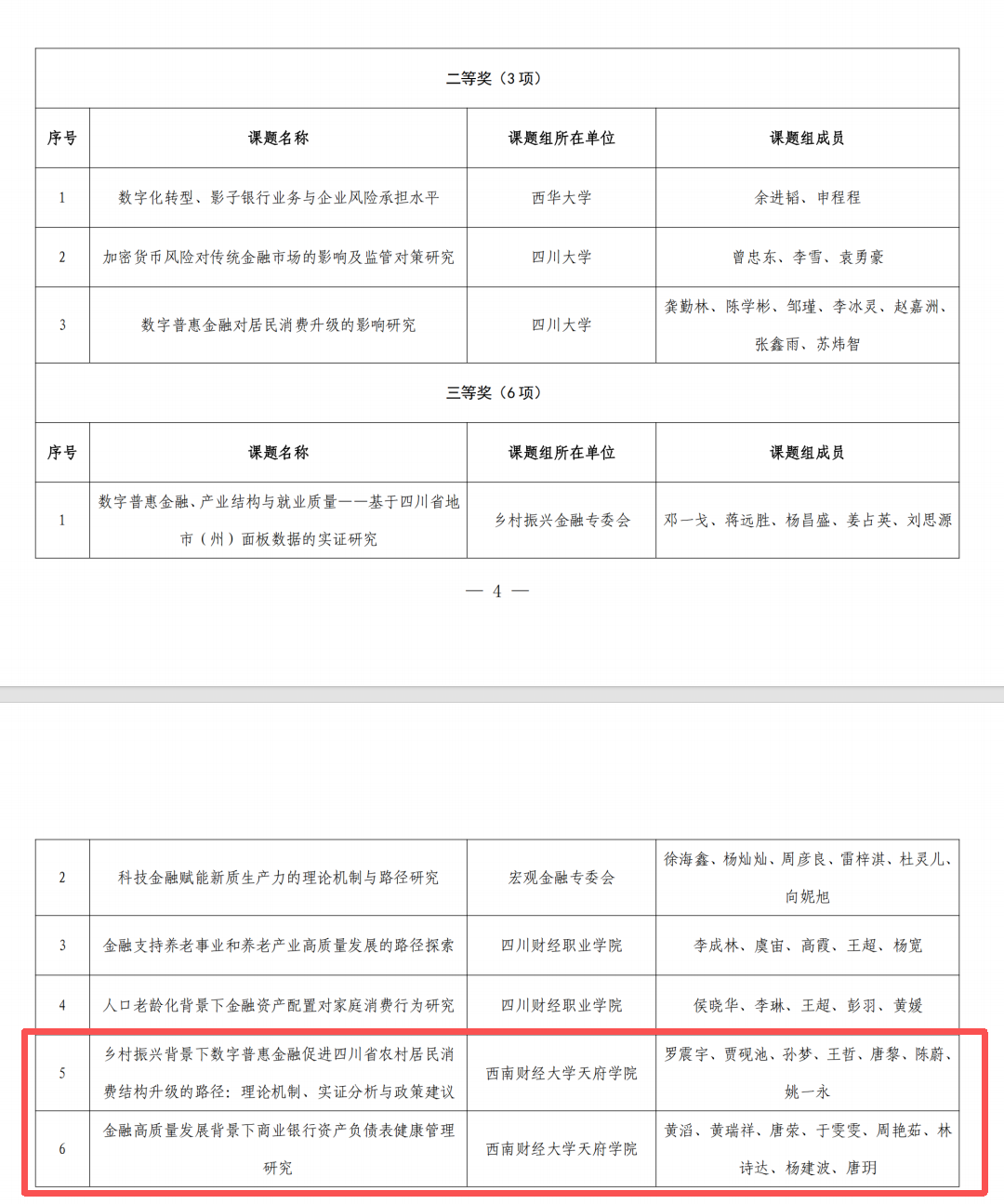 近日,四川省金融學會發(fā)布《關(guān)于公布2025年度重點研究課題獲獎名單的通知》(川金學〔2026〕1號),公布了2025年度重點研究課題評審結(jié)果。經(jīng)四川省金融學會專家評審委員會嚴格評審,學校智能金融學院金融系副主任羅震宇主持的《鄉(xiāng)村振興背景下數(shù)字普惠金融促進四川省農(nóng)村居民消費結(jié)構(gòu)升級的路徑:理論機制、實證分析與政策建議》與經(jīng)濟系黃滔博士主持的《金融高質(zhì)量發(fā)展背景下商業(yè)銀行資產(chǎn)負債表健康管理研究》均在已立項的104項課題中榮獲理論研究類三等獎。