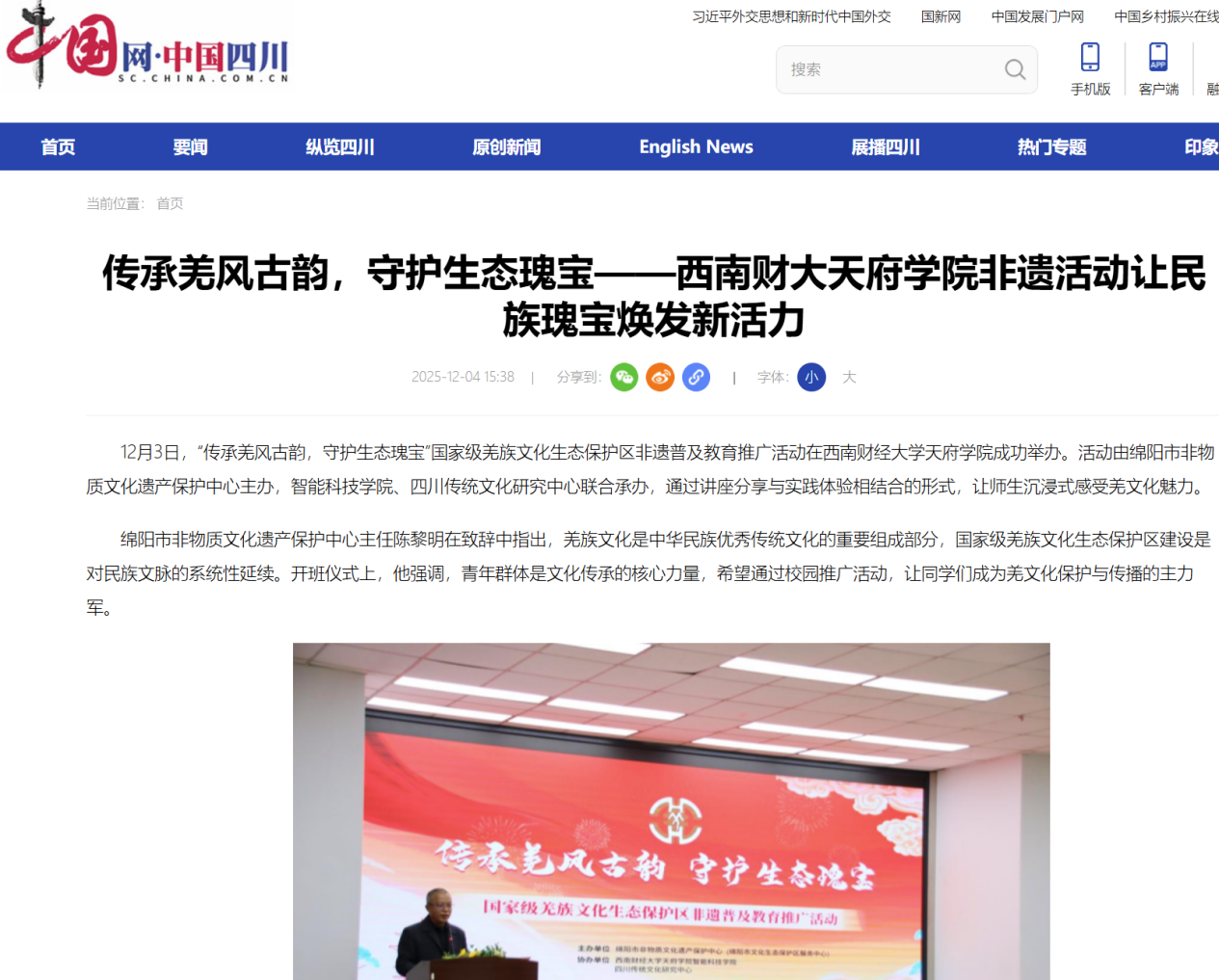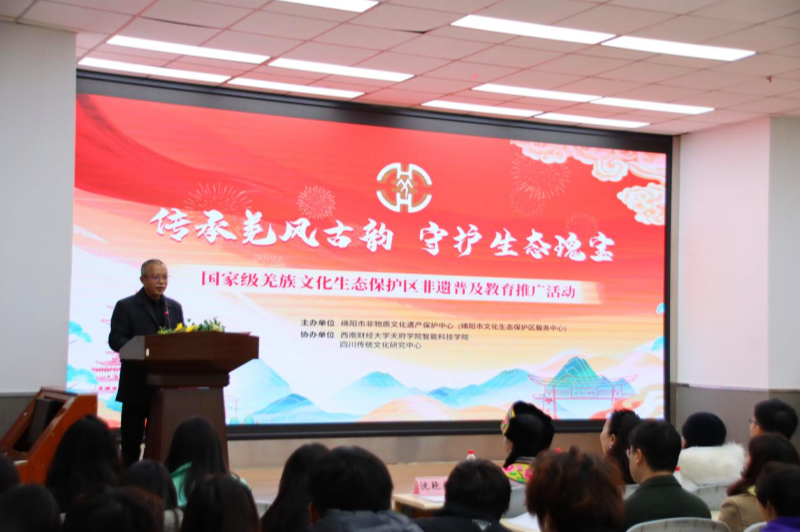 12月3日,“傳承羌風(fēng)古韻,守護生態(tài)瑰寶”國家級羌族文化生態(tài)保護區(qū)非遺普及教育推廣活動在西南財經(jīng)大學(xué)天府學(xué)院成功舉辦。活動由綿陽市非物質(zhì)文化遺產(chǎn)保護中心主辦,智能科技學(xué)院、四川傳統(tǒng)文化研究中心聯(lián)合承辦,通過講座分享與實踐體驗相結(jié)合的形式,讓師生沉浸式感受羌文化魅力。