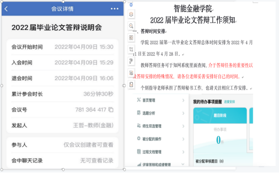 線上答辯培訓(xùn)會(huì)議及《智能金融學(xué)院2022屆畢業(yè)論文答辯須知》文件截圖
