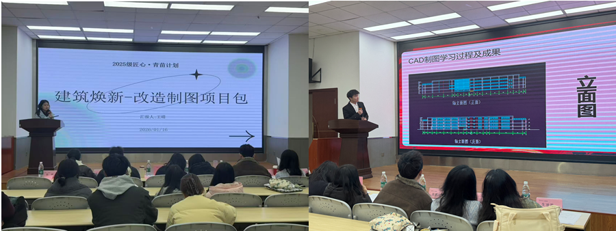 在本次答辯會中,“建筑煥新-改造制圖包”團(tuán)隊的匯報率先拉開帷幕。來自2025級匠心·青苗計劃的鄧森元和王晴同學(xué)分別代表團(tuán)隊對某教學(xué)樓改造制圖進(jìn)行了匯報,介紹了項目概況、改造要求、制圖要點(diǎn)。點(diǎn)評專家范璐瑤老師和陳鵬沖博士分別肯定了其內(nèi)容的完整性和邏輯性,建議改造方案設(shè)計時要考慮建筑類型,結(jié)合不同類型建筑完善改造細(xì)節(jié)。