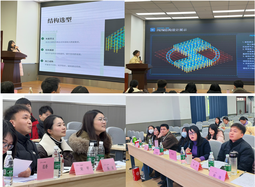之后,“結(jié)構(gòu)設(shè)計綜合實(shí)訓(xùn)包”團(tuán)隊的匯報緊接著展開。來自2024級匠心·青苗計劃的安蘇豪、鐘凱等六位同學(xué)分別以“古今共生視角下,以奎星樓文化為內(nèi)核的現(xiàn)代教學(xué)建筑創(chuàng)作”和“步步高升——斜面梯段上升與教育祝福表達(dá)”等題目,進(jìn)行了匯報。各位匯報同學(xué)都從不同視角聚焦建筑方案設(shè)計的主要理念、結(jié)構(gòu)設(shè)計的主要點(diǎn)、恒載和荷載的分析以及與AI對話的關(guān)鍵細(xì)節(jié)。點(diǎn)評專家陳倩副教授、宋平副教授和朱凌霜老師對六位同學(xué)的專業(yè)能力和匯報作品給予了高度認(rèn)可,并贊揚(yáng)了學(xué)生在設(shè)計過程體現(xiàn)的專業(yè)素養(yǎng),以及與AI協(xié)同創(chuàng)作的思維。