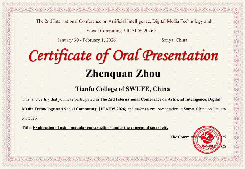 第二屆人工智能、數(shù)字媒體技術(shù)與社會計算國際學(xué)術(shù)會議(ICAIDS 2026)于1月30日在中國海南三亞順利召開。本次大會由美國克萊姆森大學(xué)主辦、紐約市立大學(xué)進行學(xué)術(shù)支持,旨在探索人工智能、數(shù)字媒體與社會計算領(lǐng)域的最新進展和前沿技術(shù)。工程與材料學(xué)院教師周楨佺博士受邀參會并完成了《智慧城市理念下模塊化建筑項目的開發(fā)探索》學(xué)術(shù)口頭報告,受到了業(yè)內(nèi)學(xué)者和專家的高度肯定。